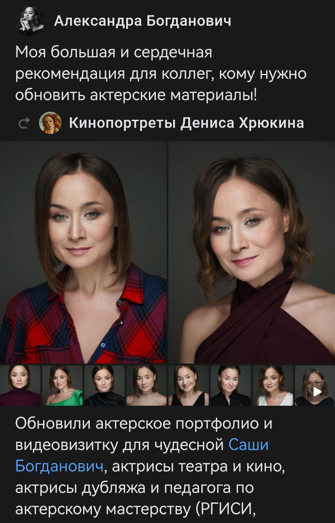 - Помогаю раскрыть актёрскую индивидуальность на фото и видео.